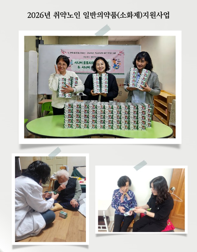 2026년 2월부터 5월까지 보건복지부와 한국사회보장정보원이 수행기관과 함께, 건강관리에 어려움을 겪는 취약노인의 소화 기능 개선과 기초 건강관리 및 삶의 질 향상을 위해 전국 14개 시·도 노인맞춤돌봄서비스 수행기관을 통해 취약노인을 대상으로 소화기능 개선을 위한 일반의약품(소화제) 지원사업을 실시하였습니다.